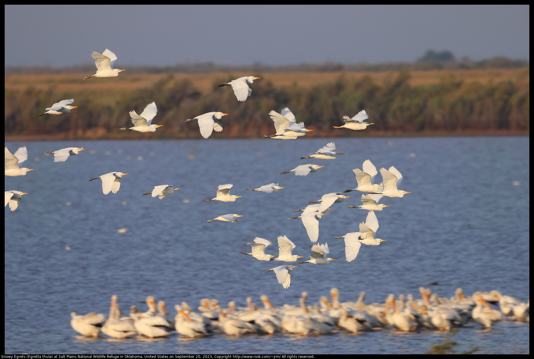 Snowy Egrets (Egretta thula) at Salt Plains National Wildlife Refuge in Oklahoma, United States on September 20, 2023