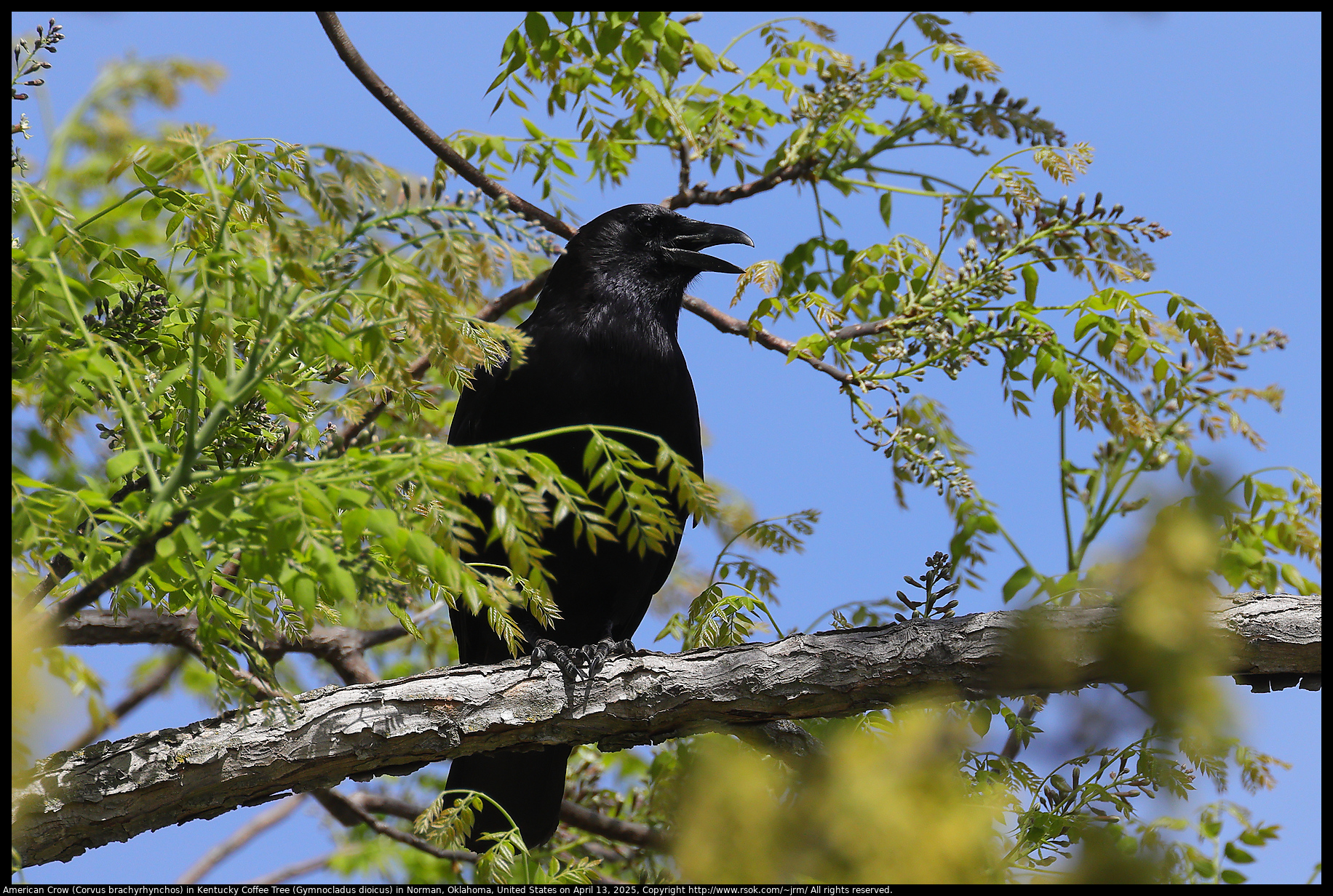 American Crow (Corvus brachyrhynchos) in Kentucky Coffee Tree (Gymnocladus dioicus) in Norman, Oklahoma, United States on April 13, 2025
