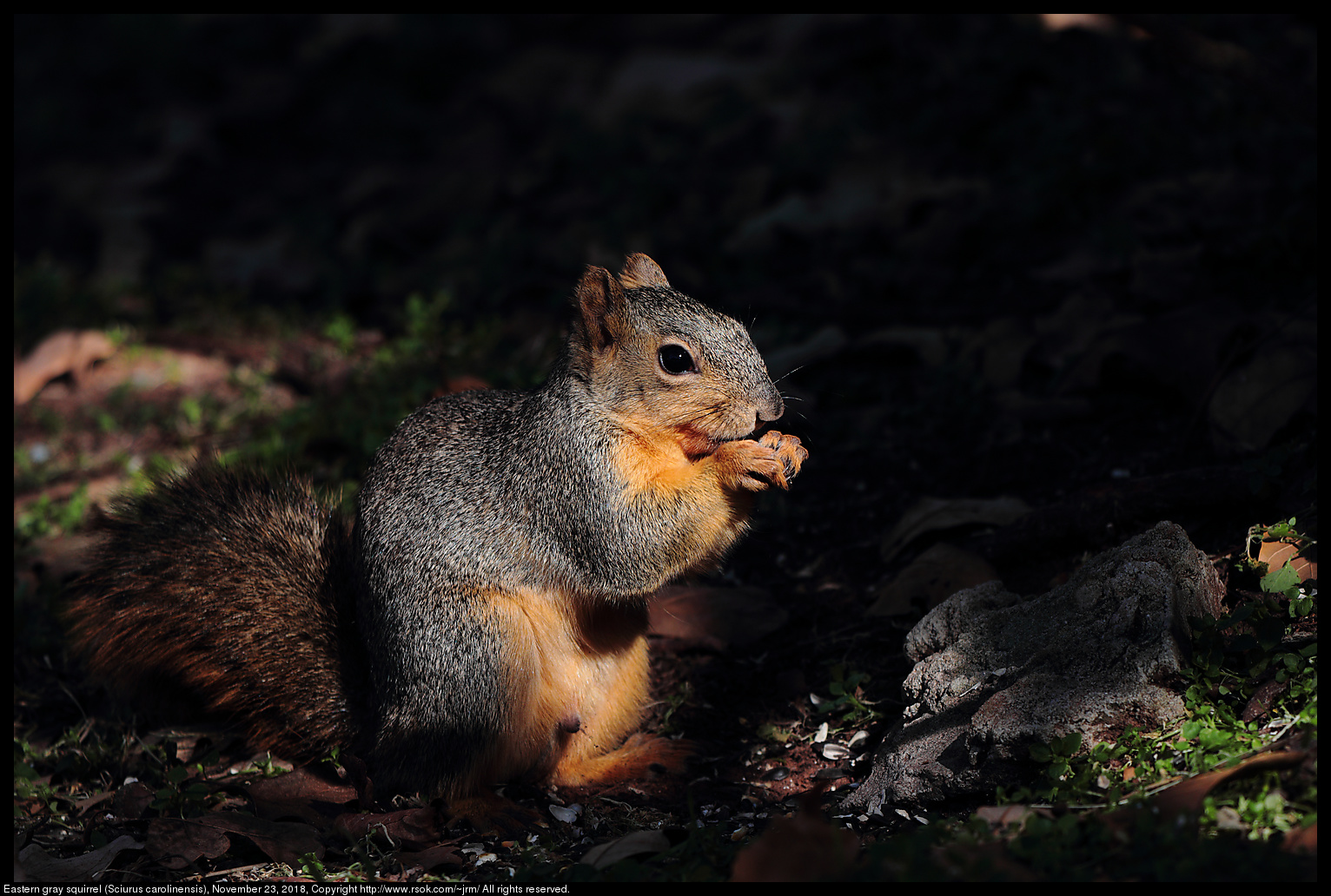 A fox squirrel (Sciurus niger) was eating a sunflower seed in late afternoon light on November 23, 2018 in Norman, Oklahoma, United States.