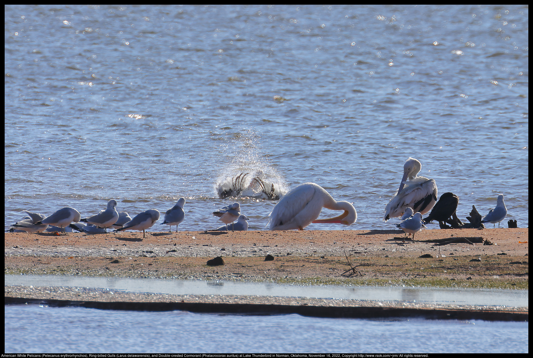 American White Pelicans (Pelecanus erythrorhynchos), Ring-billed Gulls (Larus delawarensis), and Double-crested Cormorant (Phalacrocorax auritus) at Lake Thunderbird in Norman, Oklahoma, November 16, 2022