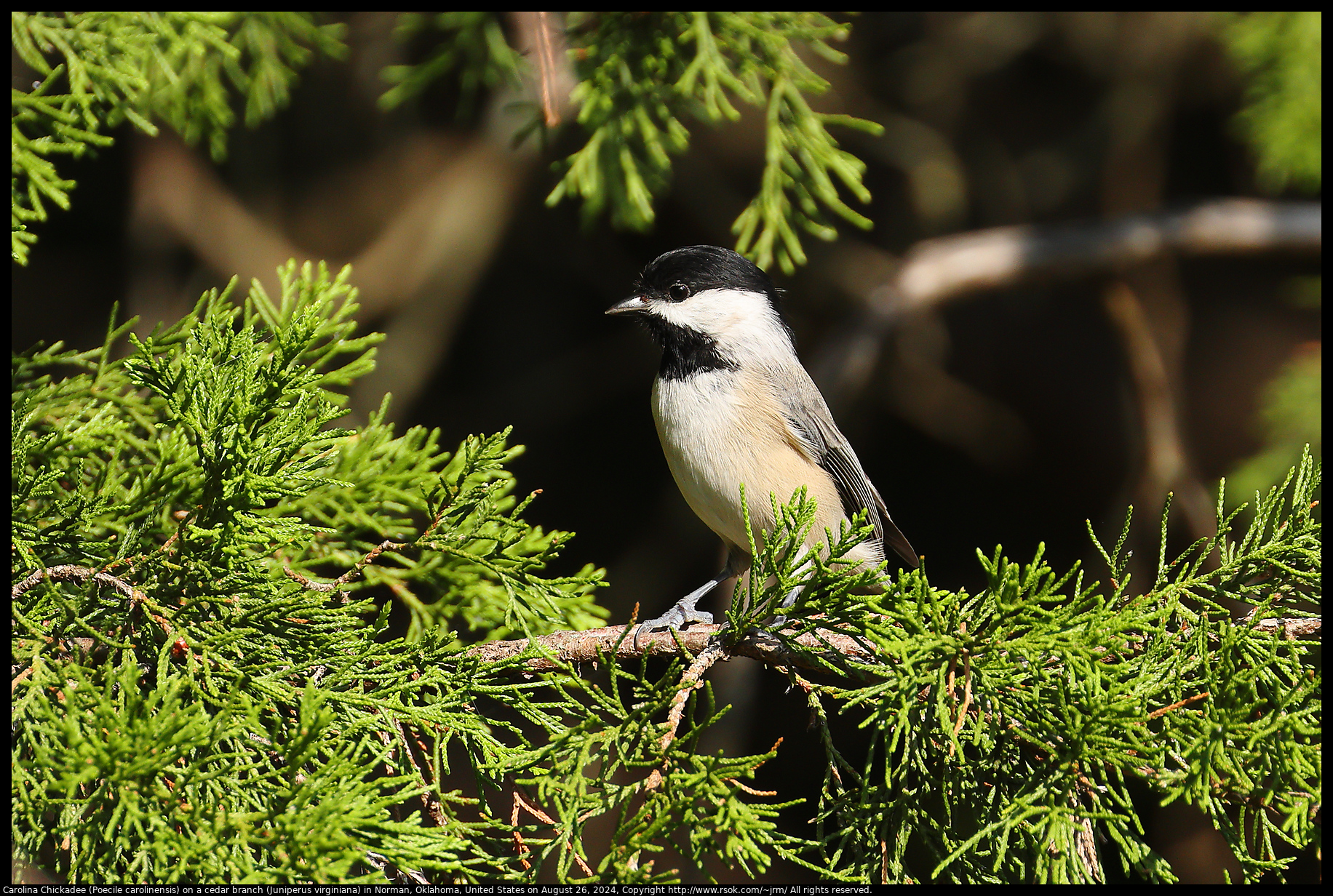 Carolina Chickadee (Poecile carolinensis) on a cedar branch (Juniperus virginiana) in Norman, Oklahoma, United States on August 26, 2024