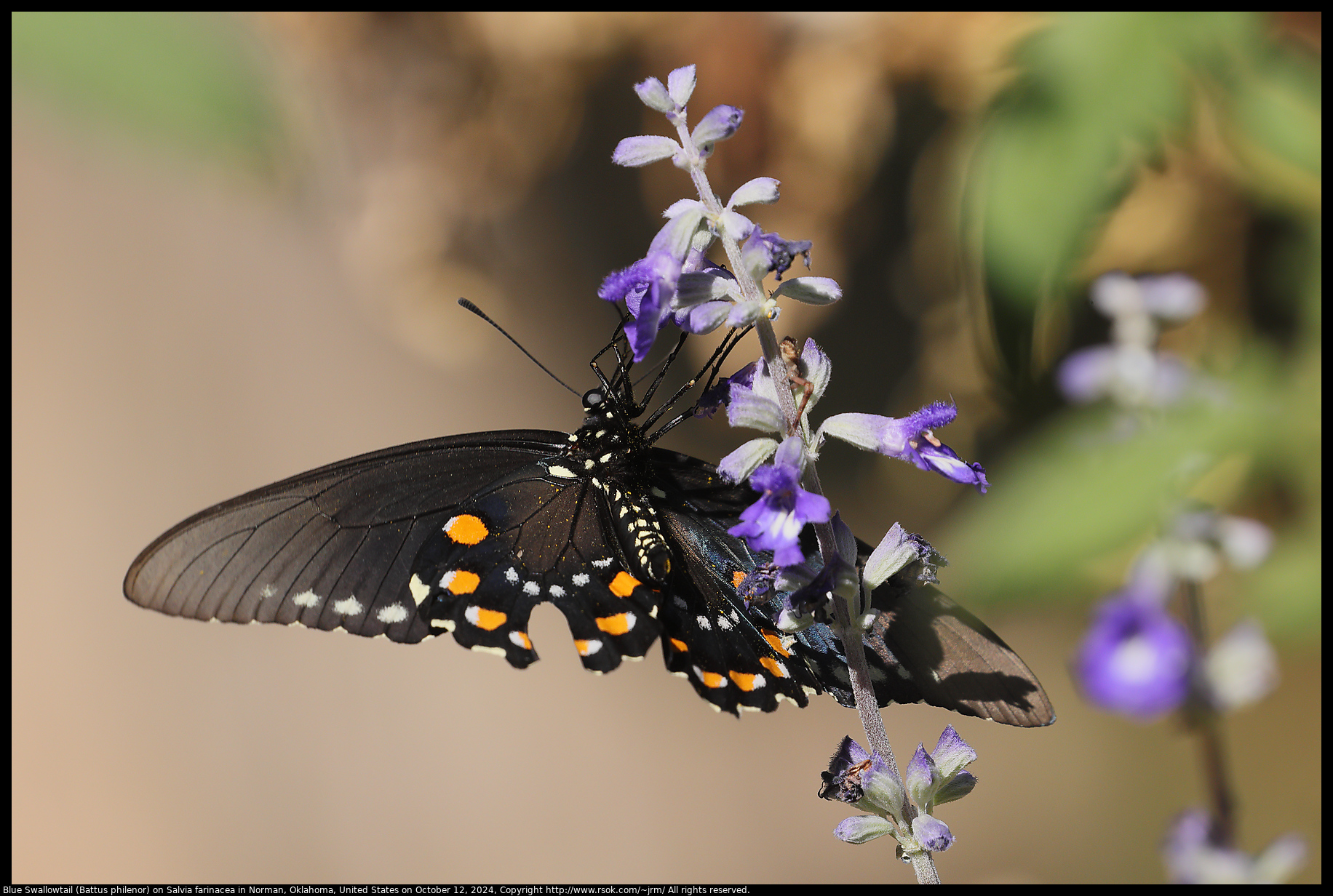 Blue Swallowtail (Battus philenor) on Salvia farinacea in Norman, Oklahoma, United States on October 12, 2024